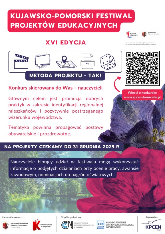 Zapraszamy nauczycieli wszystkich poziomów edukacyjnych do zgłoszenia udziału w XVI edycji Kujawsko-Pomorskiego Festiwalu Projektów Edukacyjnych.