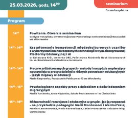 Podczas seminarium zaprezentowano sposoby rozwijania kompetencji międzykulturowych uczniów z wykorzystaniem nowoczesnych technologii i narzędzi opartych na sztucznej inteligencji. Omówiono także metody pracy w grupach zróżnicowanych, w tym zastosowanie języka migowego jako wsparcia komunikacji i integracji. Poruszono również kwestie psychologiczne związane z pracą z dziećmi z doświadczeniem migracyjnym, zwracając uwagę na ich potrzeby oraz skuteczne formy wspierania procesu adaptacji. W końcowej części spotkania podkreślono znaczenie różnorodności rozwojowej dzieci oraz indywidualizacji procesu nauczania, wskazując także na inspiracje płynące z alternatywnych nurtów pedagogicznych.